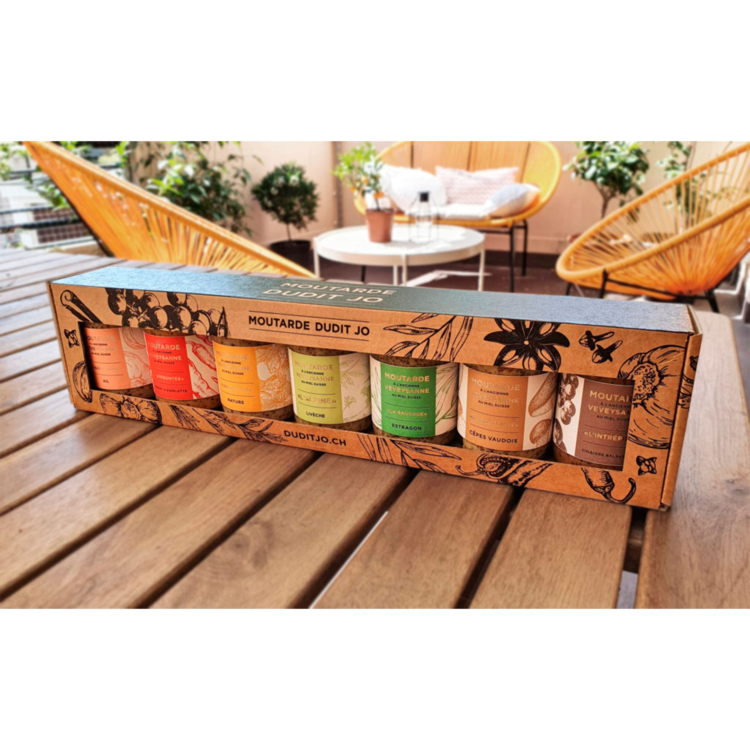 Coffret de dégustation comprenant les moutardes suivantes au format 100g: Nature, ail, estragon, piment d’espelette, livèche, cêpes et vinaigre balsamique.